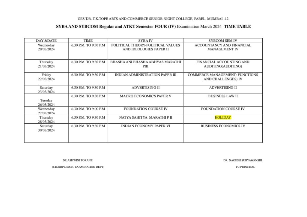 First year FY BA & BCom Sem 1 ATKT from 29 Nov. 2023 to 6 Dec. 2023 – 6:30 pm to 9:30 pm. Chairperson Dr. Ashwini Torane, Principal Dr. Suryawanshi. SY BA & BCom till 11th Oct. 2023 Result Result declared on Students Total students – Registered = Appeared = Passed = Question papers Subjectwise…